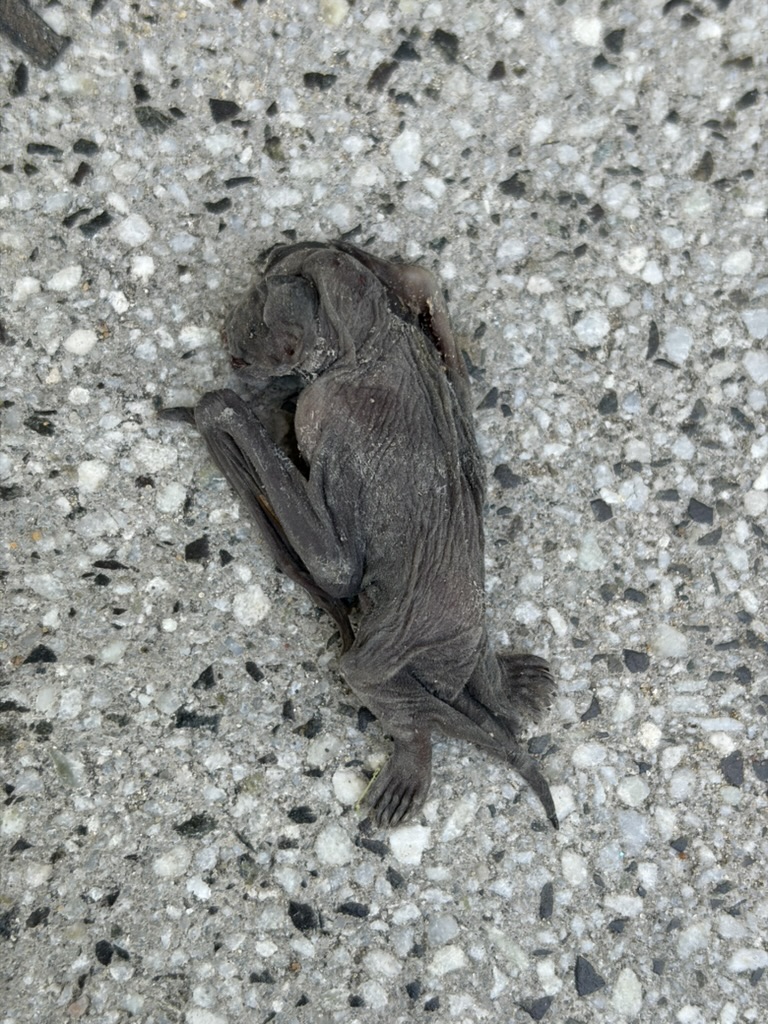 yendo a ver a rudi y diana vi un murciélago bebé en el piso, creo que se cayó naciendo, nico dijo que quizás fue el viento de la noche anterior.
