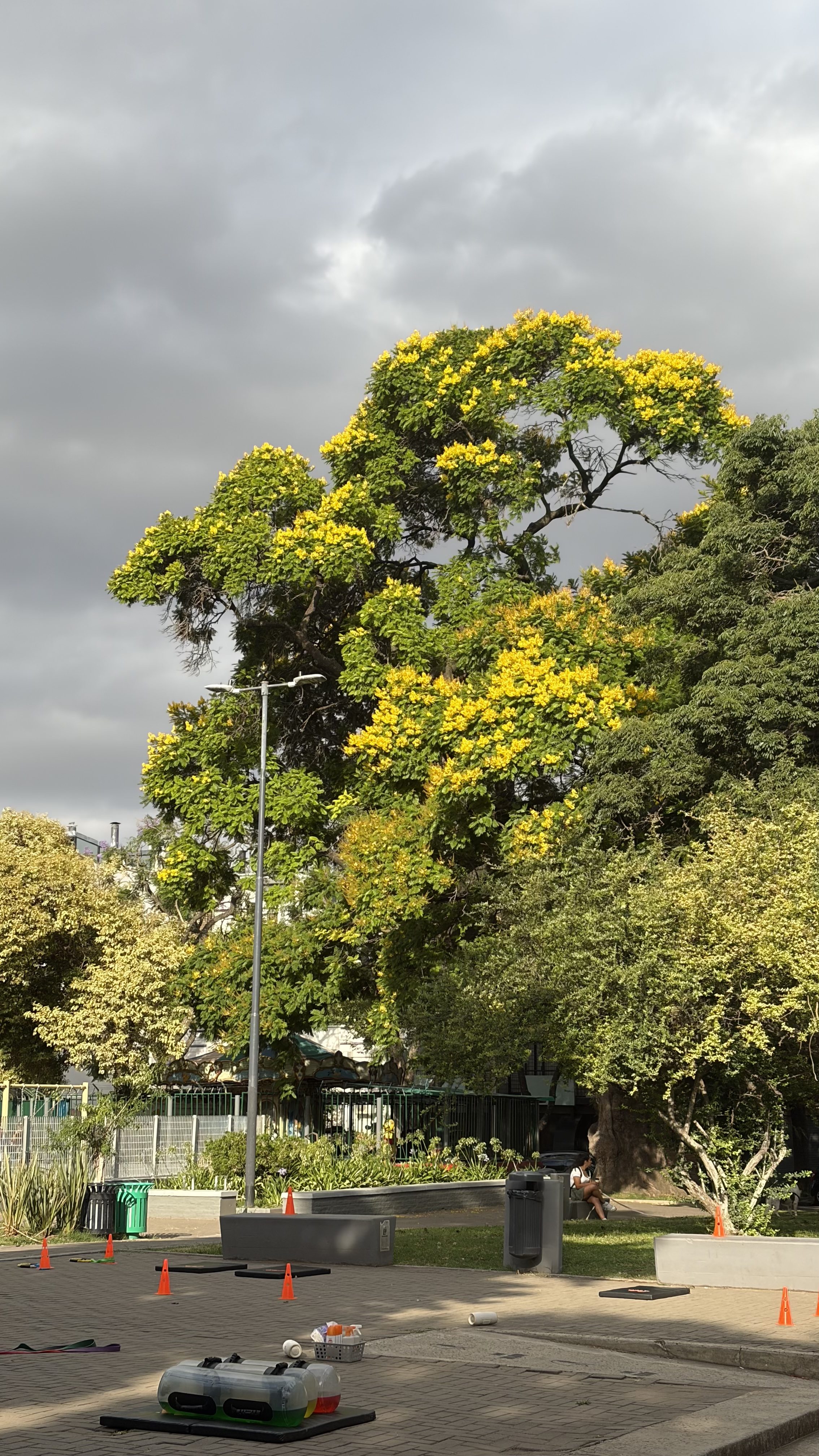 de camino al taller de dibujo la luz en los árboles estaba muy linda, y me llamaron la atención unos elementos de gimnasia.
